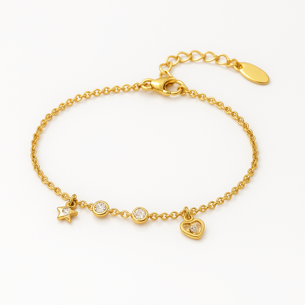 Add a touch of sophistication to your look with this delicate gold-plated charm bracelet. Featuring fine chain links and tiny charms studded with clear crystals, this bracelet is designed to shine in every moment. Its lightweight and adjustable design make it comfortable for all-day wear. Perfect for pairing with western or ethnic outfits, it’s a stylish addition to any jewellery collection — or a thoughtful gift for someone special.